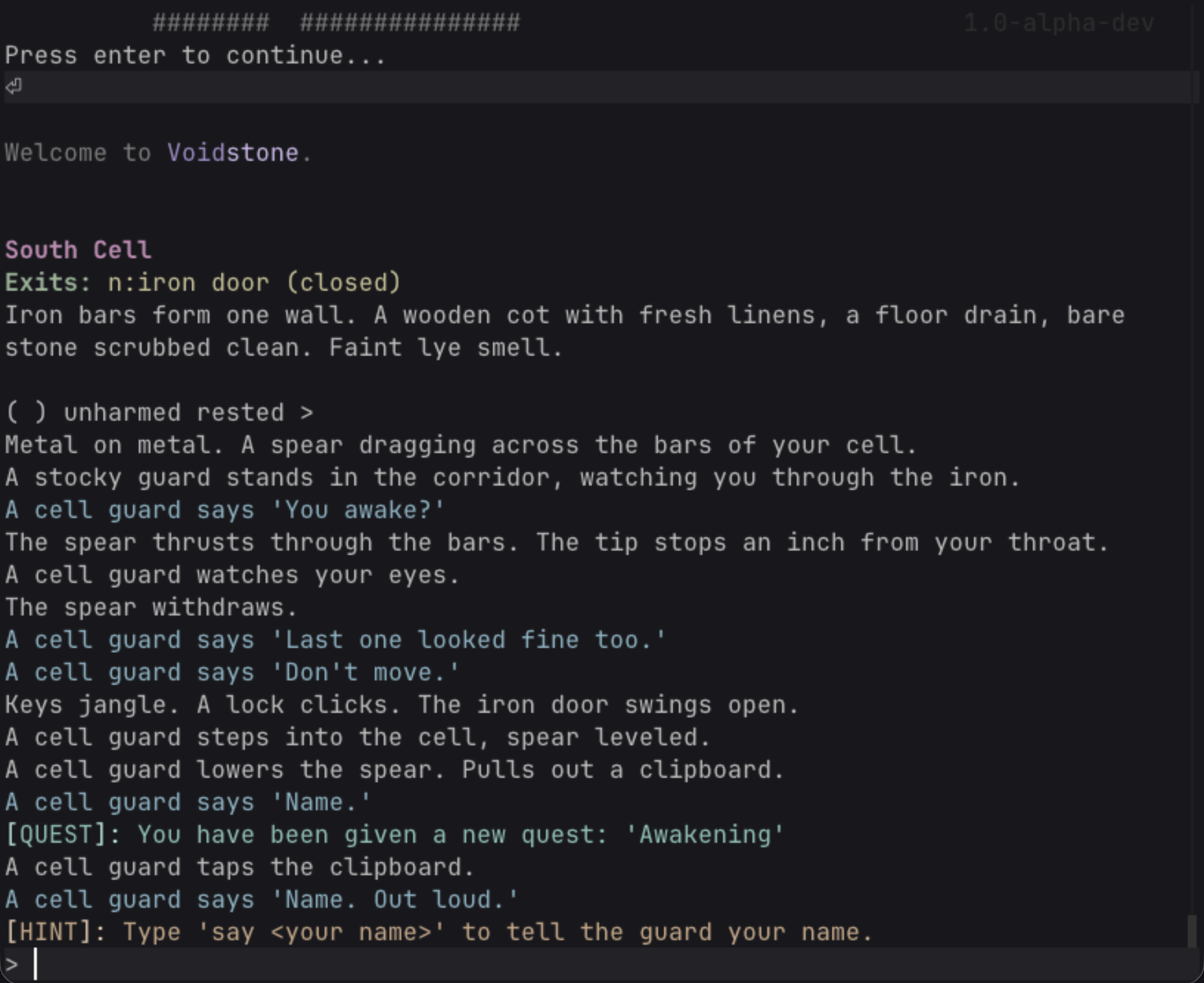 Early development. Expect bugs, a small world, and the occasional soft-lock. Save often. Use !wipe if stuck.